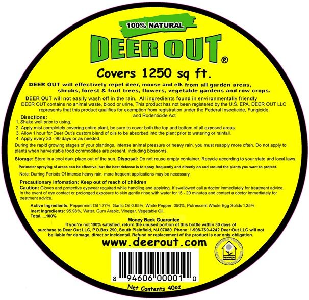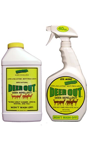 Deer Out Deer Repellent has been member tested and recommended by the National Home & Gardening club with over 650,000 members. With no harmful chemicals or poisons, Deer Out is environmentally safe and will not wash off. Under normal weather conditions, Deer Out can last up to 3 or 4 months or more.